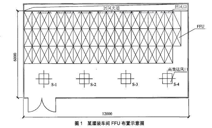 目前,許多醫(yī)藥工程設(shè)計(jì)人員采用FFU的組合來滿足局部區(qū)域的百級(jí)要求(布置見圖1所示)。由于工程設(shè)計(jì)者對(duì)FFU層流罩了解不夠,考慮不全面,在設(shè)計(jì)過程中產(chǎn)生了如下一些問題:
